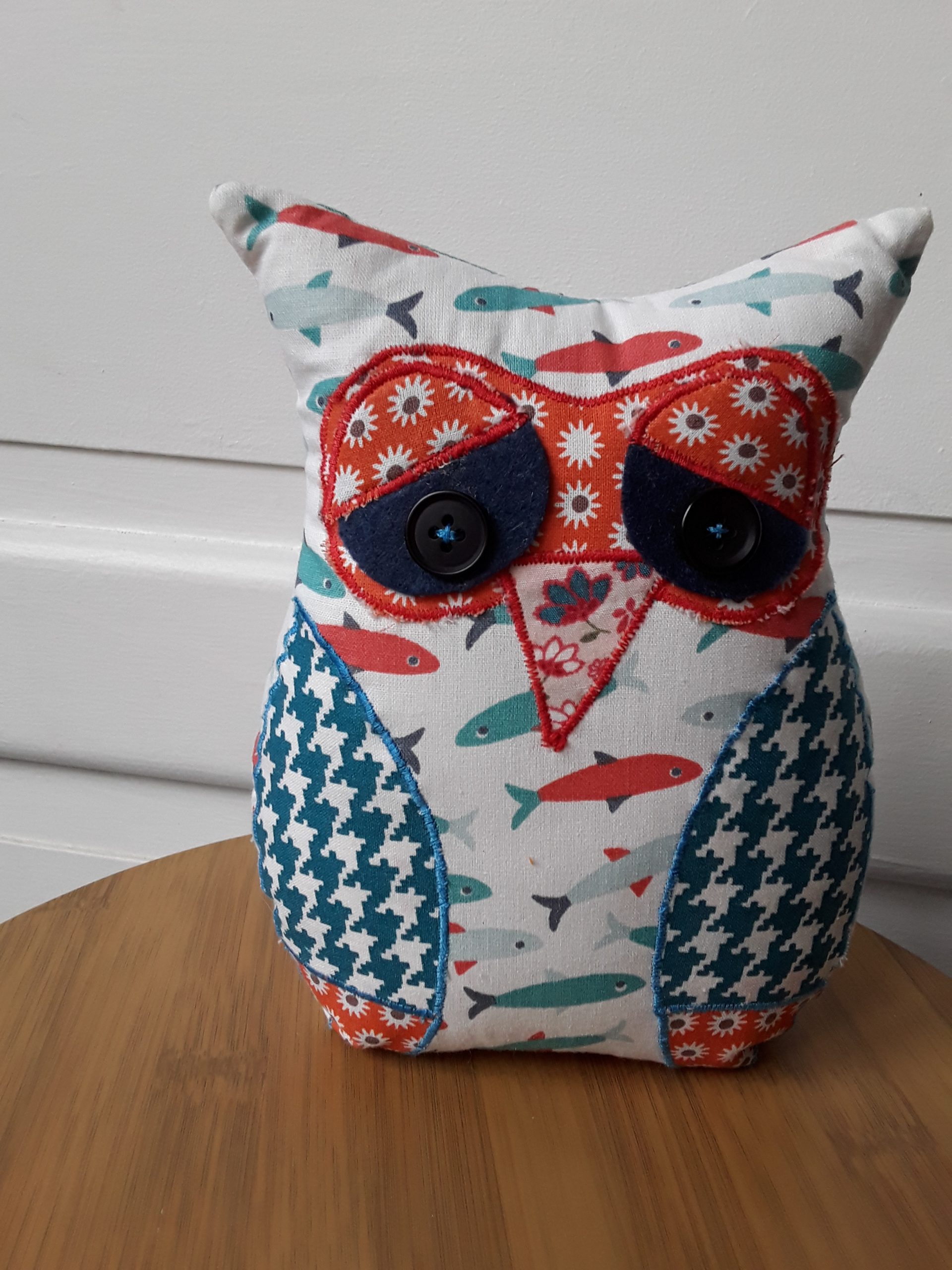 Chouette décorative réalisée à partir de chutes de tissus et de matériaux récupérés