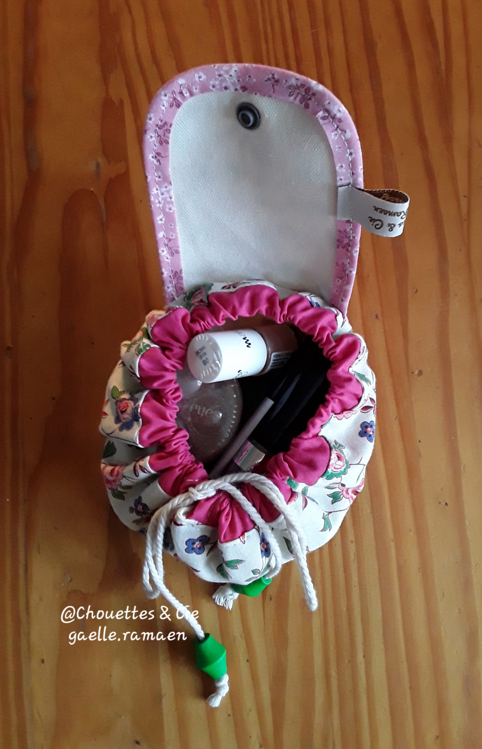Trousse de maquillage réalisée avec des chutes de tissus et matériaux récupérés .